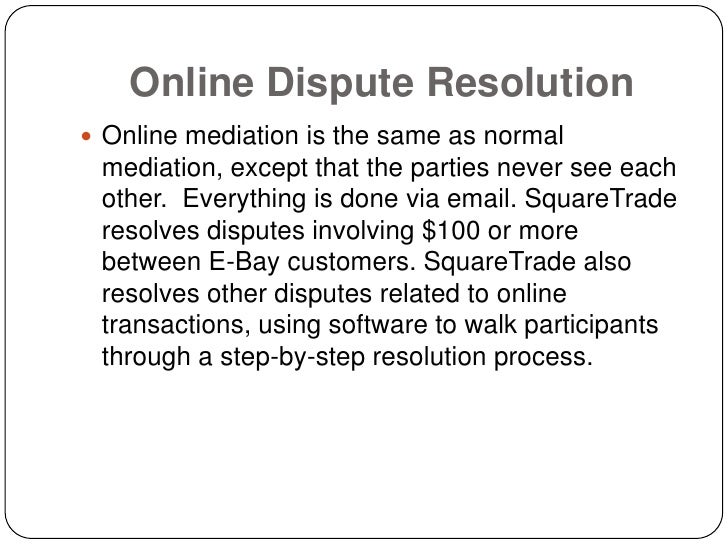 Online dispute resolution such as that offered by eBay grew out of an earlier movement called alternative dispute resolution, which promotes methods for settling cases out of court. There are various forms of alternative dispute resolution, all of which are, in general, quicker, cheaper, less formal, and more flexible than litigation. ... Get Doc