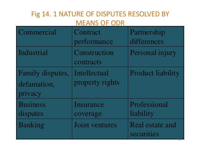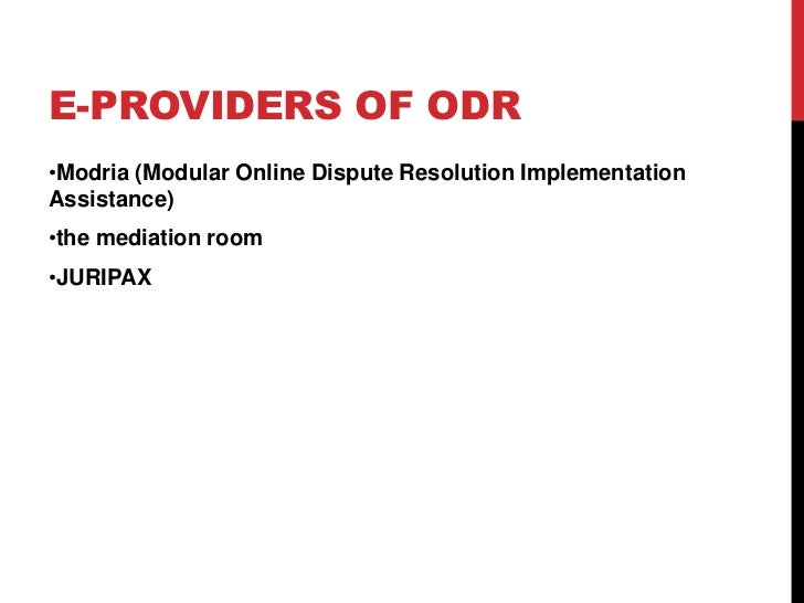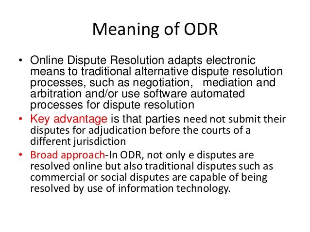 Online Dispute Resolution (ODR) for Lawyers (12/21/18) Jim Melamed This chapter focuses on areas of ODR that are likely to involve attorneys, Attorney involvement in ODR tends to be for more complex and substantial disputes, such as resolving all divorce issues or settling an estate or resolving ongoing business issues. ... Retrieve Document